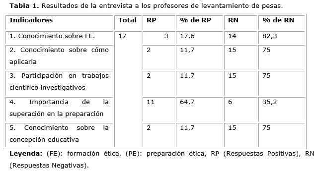 Estos resultados han permitido precisar cómo situación problemática que existen insuficiencias en la formación ética en el accionar que desarrolla el profesor de levantamiento de pesas en Pinar del Río, a tenor de las nuevas exigencias de la formación deportiva cubana.