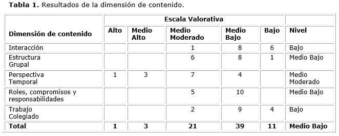 Este resultado emana de la manifestación de un desempeño medio en cuanto a los roles y responsabilidad con el grupo, perspectiva temporal y la estructuración grupal en la actuación profesional, acompañado de insuficiencia en el conocimiento de la interacción grupal del docente y el trabajo colegiado.