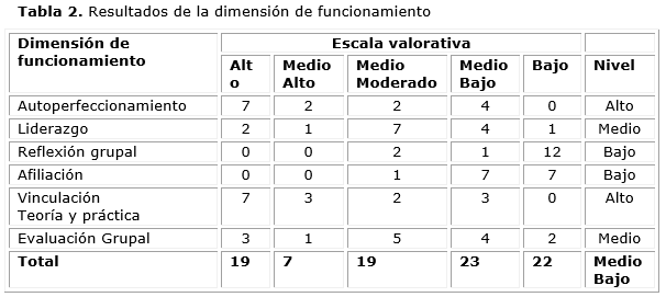 En la tabla 2 se observa una tendencia de mejor ubicación de la dimensión «funcionamiento», como el autoperfeccionamiento y la vinculación teoría y práctica; el liderazgo y la evaluación grupal, en nivel medio; y los indicadores reflexión y afiliación, en un nivel de compresión bajo.