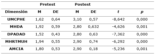 Las tablas 4 y 5 muestran los resultados del pretest y el postest de las dimensiones de la inteligencia kinestésica por género. Por lo observado, se puede afirmar que hubo un aumento significativo en las medias de las dimensiones estudiadas tanto en el grupo femenino como en el masculino, después del tratamiento basado en los juegos motrices (Tabla 4) y (Tabla 5).